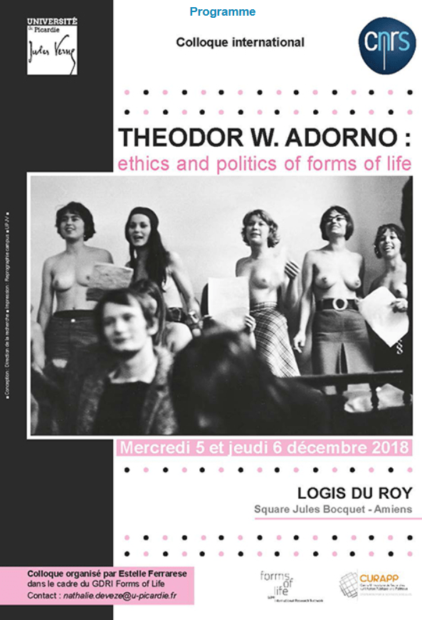 « La méthode de “l’identification dialectique” de Sohn-Rethel et la genèse du patriarcat dans la Dialectique de la raison », rencontre internationale Theodor W. Adorno. Ethics and poltics of forms of life, UPJV/CURAPP, Amiens.