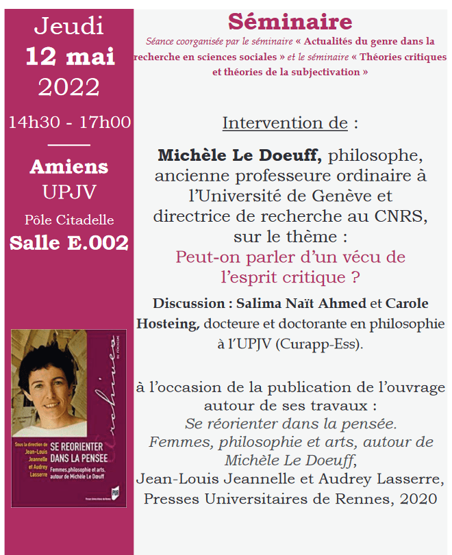 « Peut-on parler d’un vécu de l’esprit critique ? », séminaires «Genre » et « Théorie critique et subjectivation» du CURAPP, Université d’Amiens.
